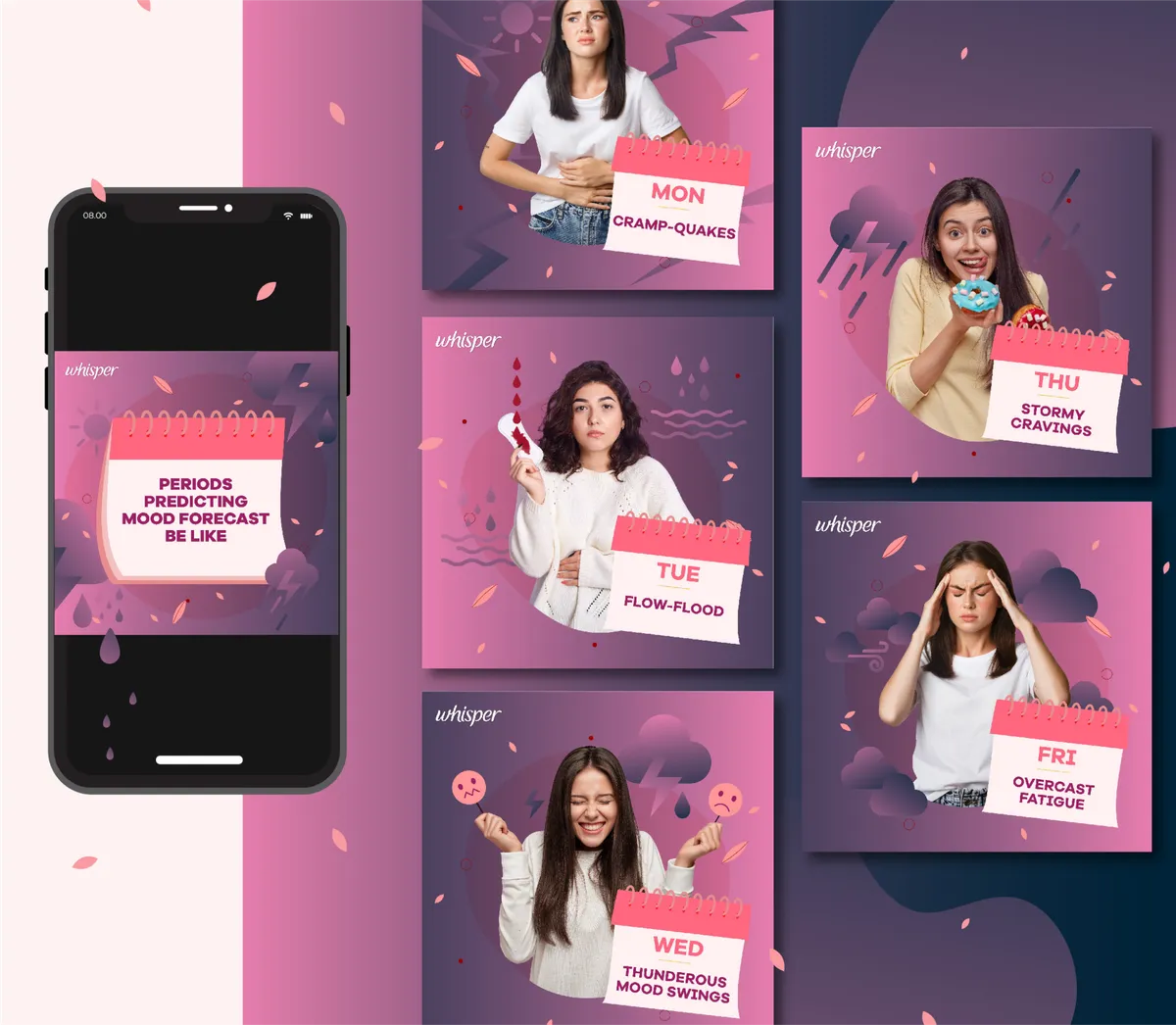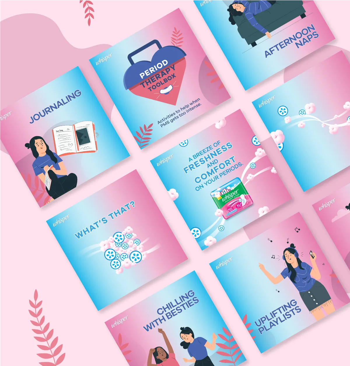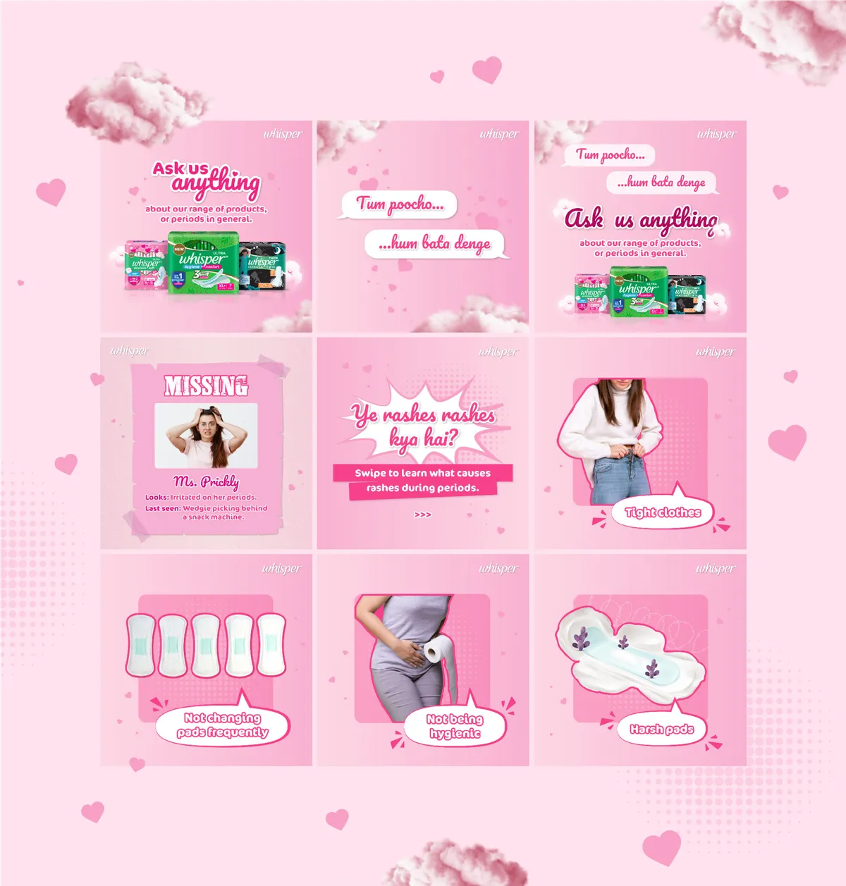 Our collaboration with Whisper India project aimed to refresh their social media presence. The redesigned campaign features vibrant aesthetics, relatable content, and an empowering message. Through multimedia elements and interactive features, we created a more engaging online space, fostering inclusivity and open conversations around feminine hygiene. The revamped social media strategy reflects Whisper India's commitment to celebrating femininity, empowering women, and breaking taboos surrounding menstrual health.